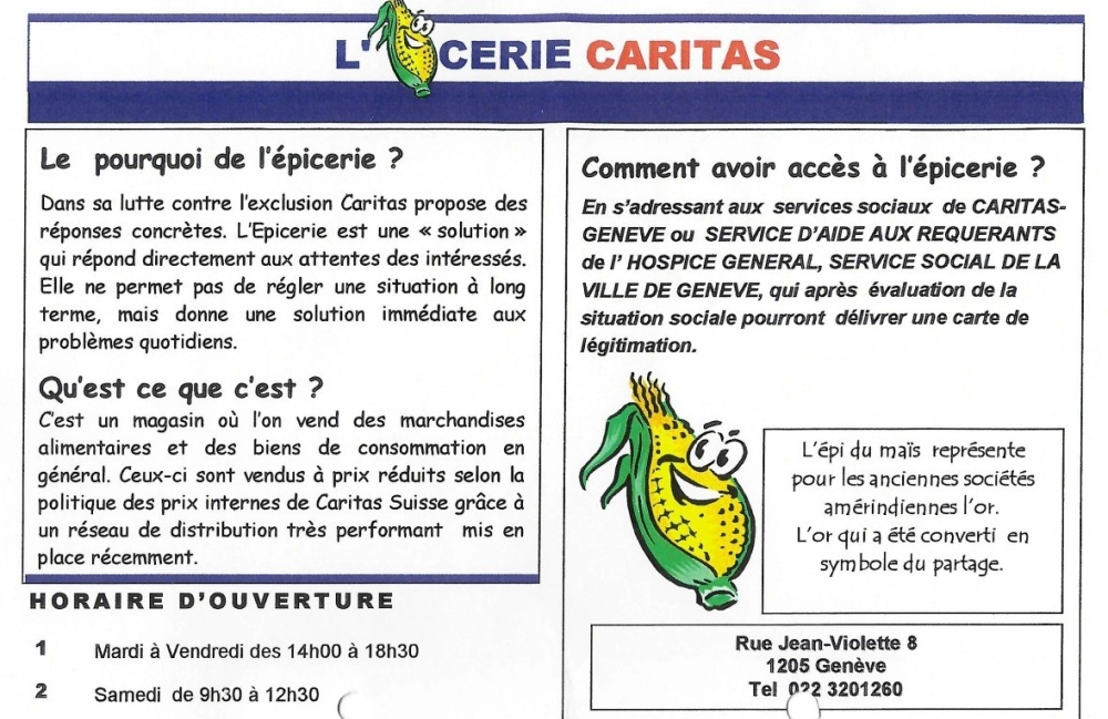 En mai 2000, un “magasin (pas tout à fait) comme les autres” ouvrait ses portes rue Jean Violette. Première épicerie solidaire du canton de Genève, elle s'inscrivait dans un projet lancé sept ans plus tôt à Bâle, avant de s’étendre en Suisse alémanique, puis en Suisse romande. Pour Gladys Corredor, fondatrice du magasin genevois, cette initiative répondait à un constat clair : une montée de la précarité. Deux enquêtes menées en 1997 et 1999 faisaient en effet état d’une situation préoccupante de la pauvreté en Suisse, notamment pour les "working poor". En partenariat avec Caritas Suisse, ce projet visait donc à offrir “une solution immédiate aux problèmes quotidiens” des personnes touchées, comme le soulignait la brochure officielle.