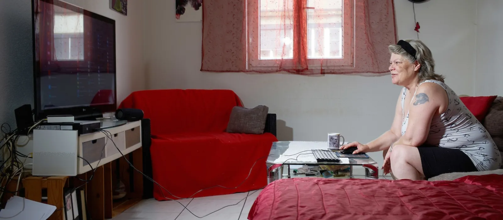 "Sans ordinateur, je ne suis plus rien!" À 55 ans, Valérie est une véritable "geekette" comme elle le dit elle-même. Curieuse de tout, elle utilise internet pour chercher et répondre à des offres d'emploi, trouver toutes sortes d'informations sur différents sujets, et même tenir un blog avec ses œuvres picturales depuis quelques années. Elle joue aussi aux Sims, un jeu vidéo de simulation de vie. "Je vis par procuration. Mes personnages ont tous de belles maisons, de beaux meubles et un super boulot!" Elle rigole en le disant, mais cette bénéficiaire du RI (Revenu minimum d'insertion) vit du minimum vital depuis plusieurs années, se débrouillant comme elle peut pour rester optimiste. "Je ne baisse pas les bras, même si j'ai peu de chances à mon âge de retrouver du travail et ce d'autant plus que j'ai des problèmes de santé physiques et psychiques. Je n'avais plus d'ordinateur depuis un moment. J'ai pu aller en chercher un chez Caritas Vaud grâce à un bon. J'ai obtenu un ordinateur dernier cri que je branche sur ma télévision. Je suis ravie."