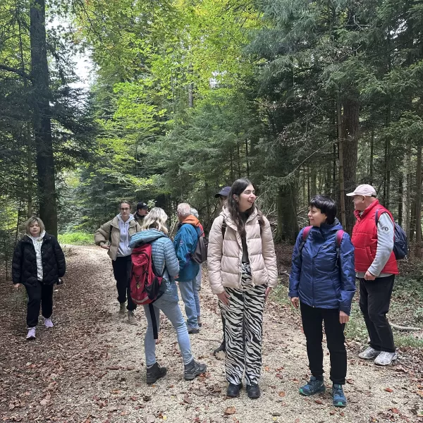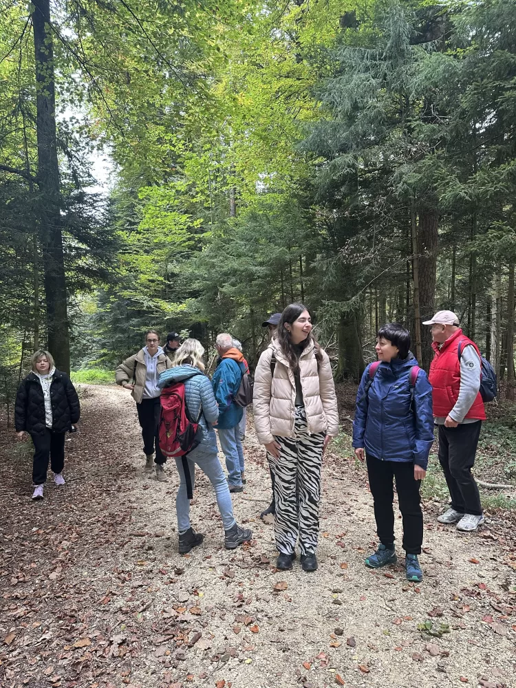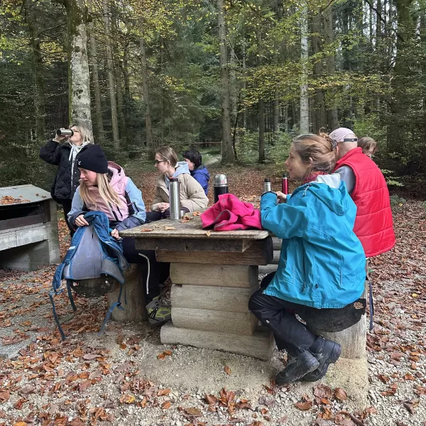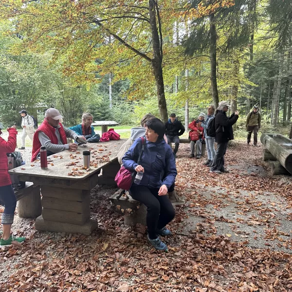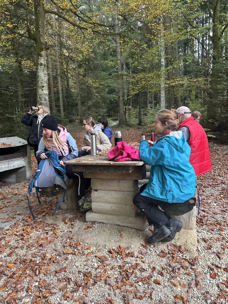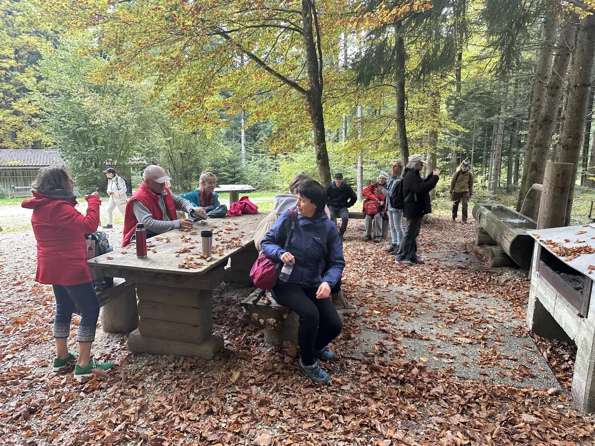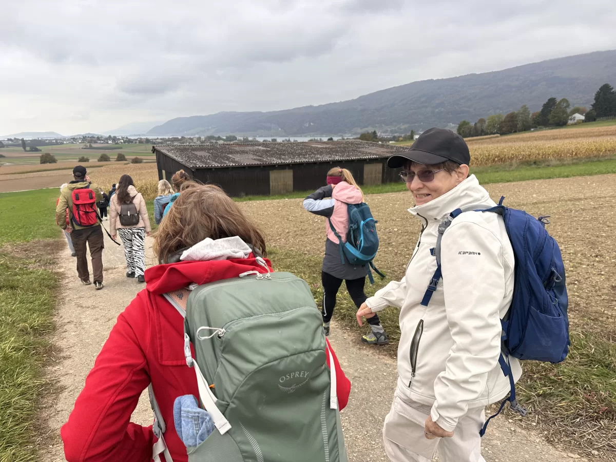 Treffpunkt war um 9.45 Uhr beim Haupteingang des Bahnhofs Biel. Trotz des wolkenverhangenen Himmels war die Stimmung von Beginn an heiter und erwartungsvoll. Gemeinsam fuhren wir mit dem Bus bis nach Port, wo wir unsere Wanderung starteten. Der Weg führte uns in gemächlichem Tempo durch herbstlich gefärbte Landschaften in Richtung Bellmund. Über die Widmatte genossen wir das farbenfrohe Mosaik der Felder und einen traumhaften Blick auf den Bielersee – ein erstes Highlight des Tages. Weiter ging es durch den stillen Oberholz-Wald, dessen Wege von buntem Laub bedeckt waren. Die Natur zeigte sich von ihrer spätherbstlichen Seite – auch wenn sich die Sonne hinter den Wolken versteckte, konnten wir die warme Farbpalette des Herbstes in vollen Zügen geniessen.