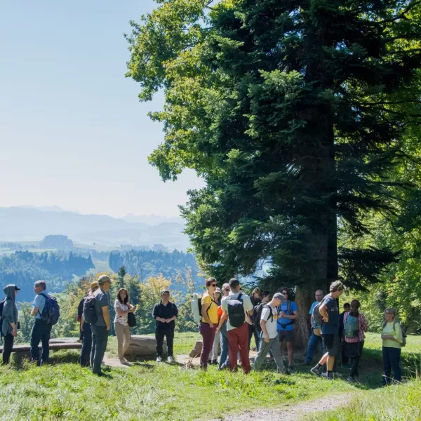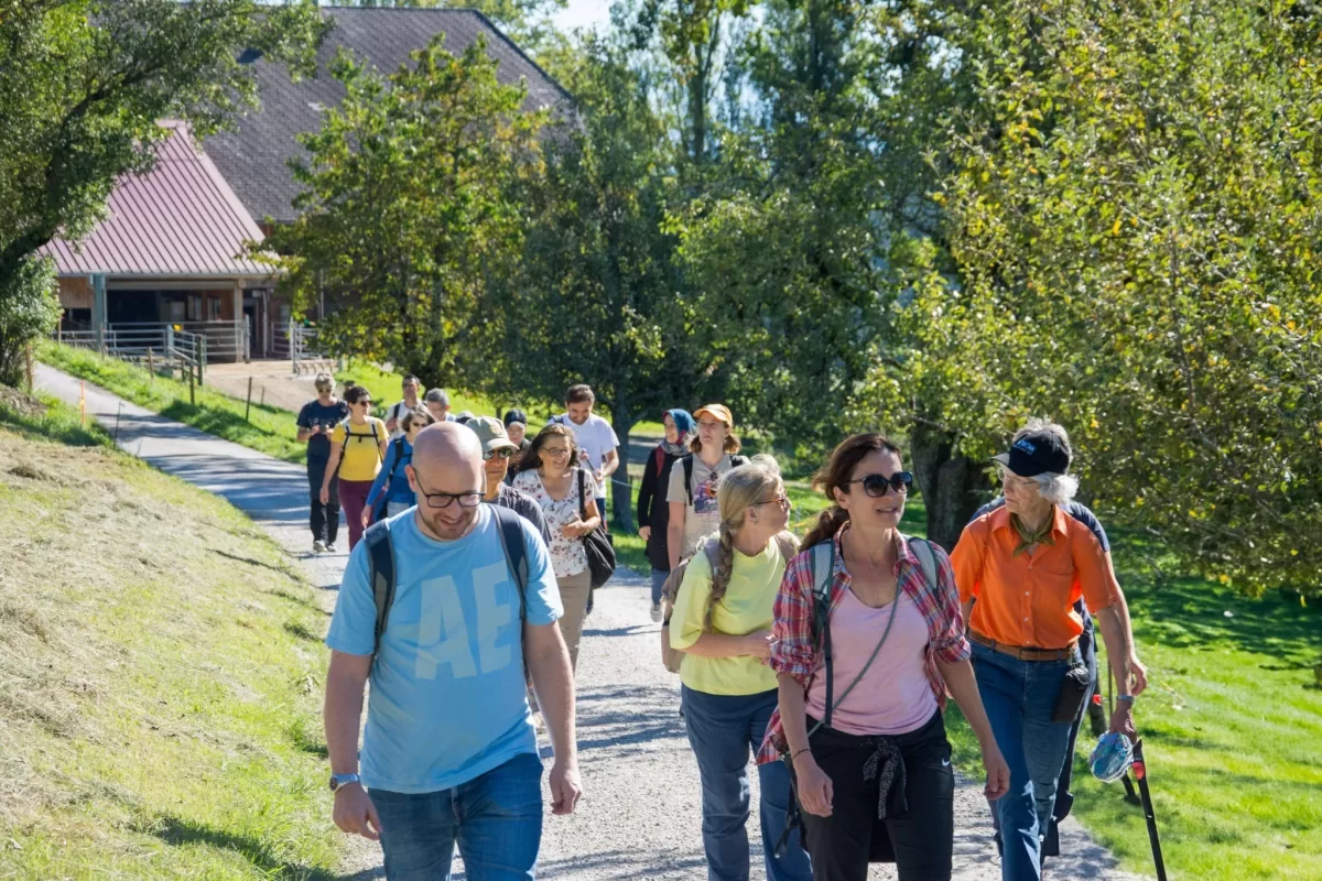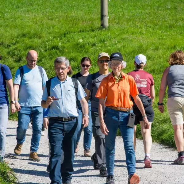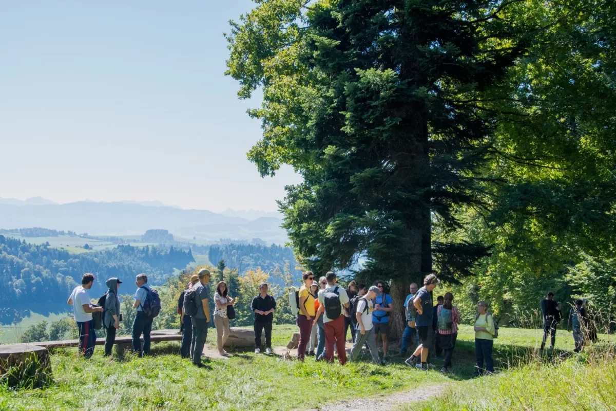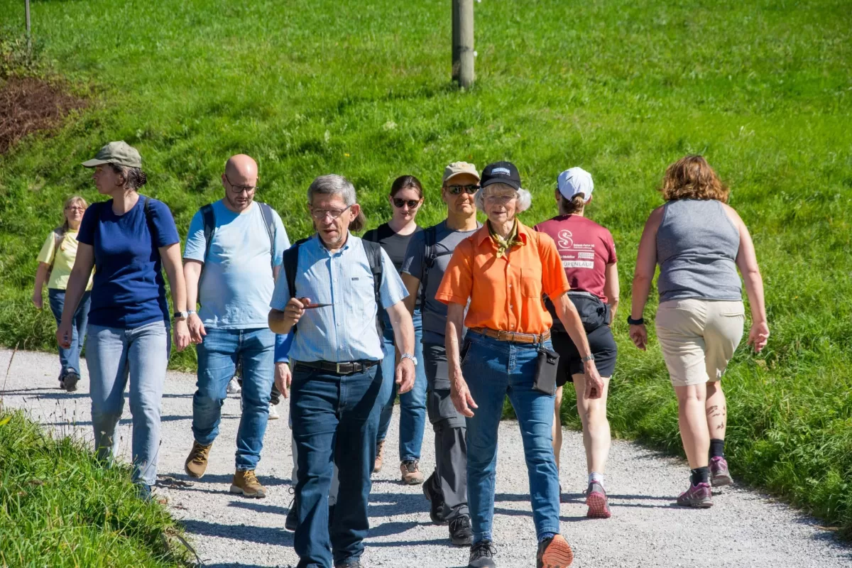 Der Abstieg nach Schliern führte durch eine abwechslungsreiche Landschaft mit Wäldern, Wiesen und immer wieder neuen Perspektiven auf die Umgebung. Dabei kam es zu einer spontanen, kleinen Pilzkunde: Einige aufmerksame Teilnehmende entdeckten am Wegrand verschiedene Pilze, was schnell das Interesse der Gruppe weckte. Gemeinsam wurde eifrig bestimmt und diskutiert.
