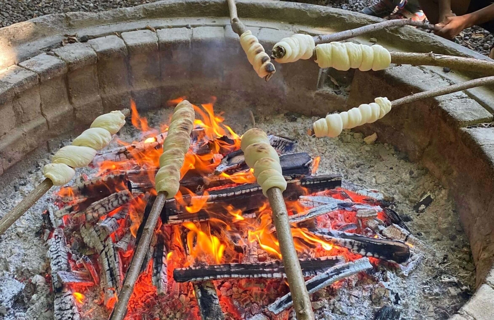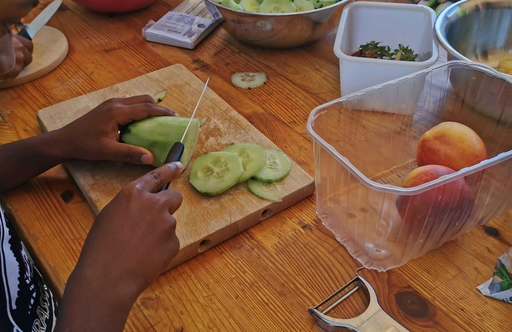 Bei einer Waldhütte wurde zusammen für Salat geschnipselt.