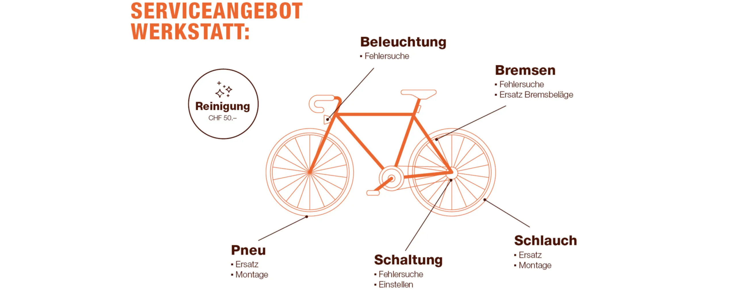 Ihr Velo kann im Nu wieder fahren und glänzen: Wir bieten eine Fahrrad-Reinigung sowie folgende Kleinreparaturen an.