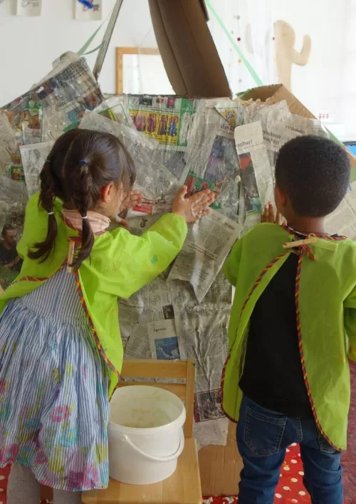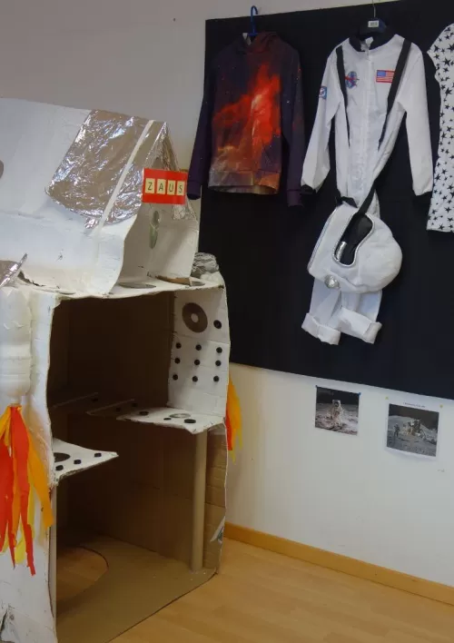 Wir greifen die Fragen und Interessen der Kinder auf. Ein Junge wollte zum Mond fliegen und alle halfen mit. Wir stellten ein Projekt auf die Beine, in dem wir uns mit dem Wunsch auf verschiedene Arten befassten und förderten dabei alle möglichen Entwicklungsbereiche: Sprache, Grob- und Feinmotorik, Sensorik, sozialer- und emotionaler Bereich und Kreativität.