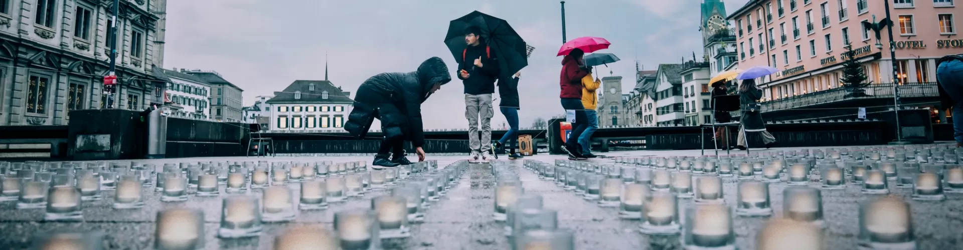 In Zürich werden wir ein weithin sichtbares Zeichen der Solidarität setzen, indem wir die überdachte Vorhalle des Helmhauses am Limmatquai in ein schimmerndes Kerzenlicht hüllen. Zwischen 17.00 bis 19.00 Uhr geben wir Gratis-Kerzen zum Aufstellen ab und schenken warmen Punsch aus. Alles in einer wunderschönen Kulisse.